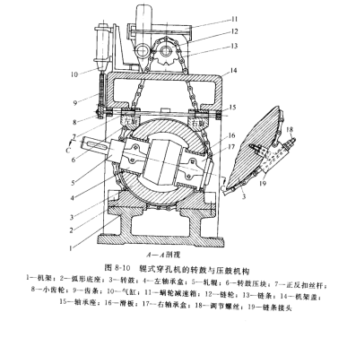 穿孔机的主传动是由异步电动机经减速箱,万向将方向相同的旋转运动传给工作轧辊2,每个轧辊的两端辊径置于轴承盒3中,两个轴承盒用连接板连接在一起,房在圆形转鼓10的滑槽内,转鼓是置于机架下部用螺栓安装的两个圆弧形底座上(见图8-8,图8.9)