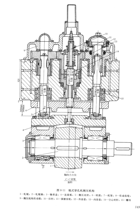 和一般轧钢机相似,穿孔机轧辊还必须有侧压机构,以改变两轧辗间距离,使钢管获得所要求尺寸。如图8-11、图 8-12 所示,在机架侧面安装着侧压机构的传动箱,电动机通过蜗轮减速箱减速,将旋转运动传递给三个相互啮合的传动齿轮 8,使三根丝杆同时前进或后退。左、右两侧的丝杆5穿过转鼓背面月牙形孔(见图 8-9),压紧在轴承盒连接板上的推力轴承座十(见图 8-12)。当齿轮8 旋转时,由干螺母15 固定在机架上,故丝杆5一一面转动。一面向前推动连接板、轴承盒及 轧辊在转鼓的滑槽内移动,使两个轧辊间距离得到调整 。