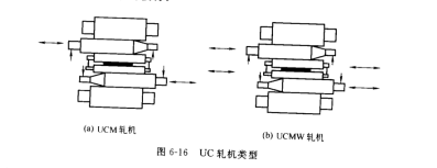 四辊轧机工作辗的挠度如图 6-17 所示。由于在工作辊与支承辊的接触压扁上存在着有害的 A 区,即大于轧制带材宽度的工作辊与支承辊的接触区,因此,在 A接触区的接触应力形成一个使轧辗挠度加大的有害弯矩。这样工作辊的挠度不仅取决于轧制力,而且也取决中间辊弯辊装置。根据 HCM六辊轧机的形式增加中间辊弯辊装置的 UC轧机称为 UCM 轧机厂图6-16(a),而具有中间辊和工作辊都能抽动又有中间辊弯曲装置的 UC轧机称为UCMW轧机「图 6-16(b)。UC轧机比 HC轧机具有更大的压下量和更强的板形控制能力,可以轧制更薄、更宽、更硬的板带,并能较好地控制复合浪形和边部减薄量,适合于轧制薄而宽且具有一些特殊要求的板材。