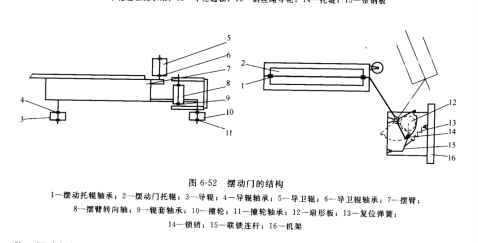 摆动门上的摆动托辗用以托住带钢板,起到托辊作用。该轮位于活套车运动的水平线上, 当活套车运行到该辊处时,托辗必须打开,两个摆动托辊向两侧分开,故称为摆动门。当活套车返回,并且过了该辊后,摆动门自动关闭,继续托着活套车后面的带钢板。图 6-52所示为摆动门的结构。
