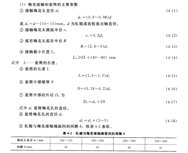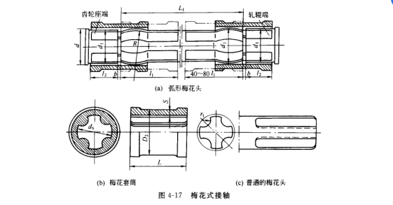 (2)梅花接轴材料 梅花接轴通常采用铸钢或锻钢,其材料性能为bs=5000~6000kg/cm2,∮=16%,梅花轴套一般用灰口铁柱成,当应力较大时,个别采用铸钢。