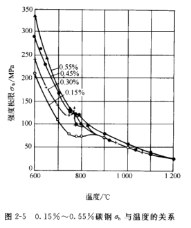 (2)变形温度的影响 温度是对变形阻力影响较大的一个因素,他随变形温度的升高,各种金属和合金所有的强度指标(屈服极限,强度极限和硬度等)均降低。有图2-5可知,随着变形温度升高,不同金属或合金变形阻力之间差别缩小,在高温下,含碳量对变形阻力影响不小。