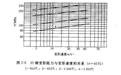 在热轧生产中,变形速度对变形阻力影响显著。通常随着变形速度的提高,变形阻力增大,在双对速坐标中呈线性关系,且变形温度越高,直线的斜率越大(见图2-6)。这表明,在高温加工时,变形速度对变形阻力的影响较大,冷加工情况下影响极小。