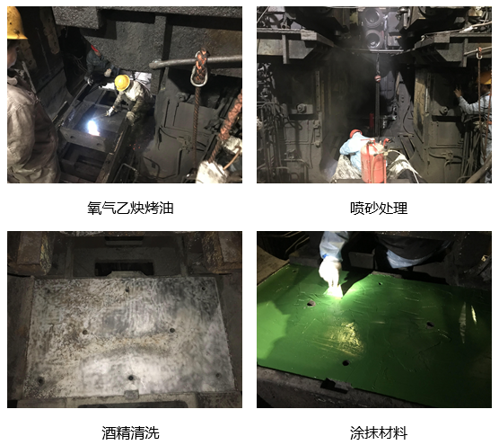 该钢铁企业1580车间粗轧轧机出现之前有过腐蚀一直用车床做减法加厚衬板,从较早的3mm减到现在的磨损14mm,该企业担心多次加工会对牌坊刚度造成不可逆的影响,企业联系到我司经过多次技术交流选择了使用高分子复合材料技术将磨损的牌坊底面恢复至原设计尺寸。