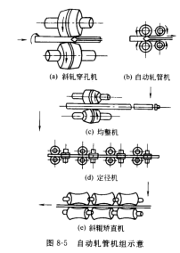 大外径来表示。不同型号自动轧管机组的组成有些不同,但都有斜轧穿孔机、自动轧管机、均整机、定径机和斜辗矫直机,如图8-5 所示。