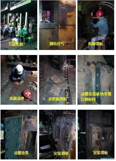 一般针对轧机牌坊滑块位压亏的问题,企业通常采用添加金属垫片来解决此类问题,由于压亏部位尺寸不均匀,导致其修复效果不理想。激光熔覆技术修复成本过高,工期长等原因无法在短时间内完成修复。现场修复是近几年兴起的一种检修模式,其原理是在不机加工的前提下,采用索雷碳纳米聚合物材料修复技术在现场进行修复。修复用的材料固化后形成的化学键连接作用力使其与修复的金属部件形成优异的粘着力,满足设备在运行中承受各种复合力的要求。此类修复材料性能较为可靠。