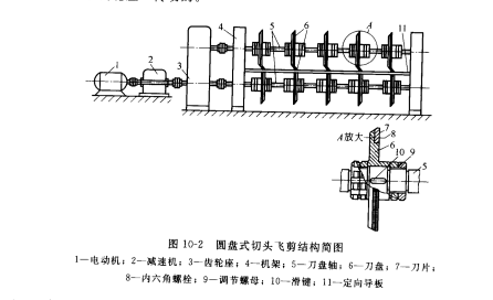 图 10-2 所示为某厂小型车间的圆盘式切头飞剪结构简图,该车间采用5槽轧制。即在刀盘轴5上装有五对刀盘6,为了便于刀片的安装,圆盘刀片7是由两个半环组成,用内六角螺栓 8 固定在刀盘6上,为了便于轧件咬入,在刀盘圆周上滚有花纹。圆盘刀片是由电动机1经减速器2和齿轮座3传动的。