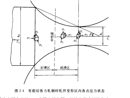 变形区内各点的应力状态是不均匀的。在有前后涨力轧制时,变形区中部呈三向压应力状态,靠近入口和出口处,由于张力的作用,金属呈一向拉应力和两向压应力状态,如图2-4所示。变形区内应力状态的形成,主要是由于接触弧上单位压力和摩擦力的影响。单曹成应力状态分布不均匀的现象,则受到很多因素的影响。