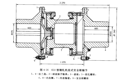 图4-16所示为650型钢轧机齿式安全轴节,结构上是一个齿轮联轴器,装设在减速机与齿轮座之间。