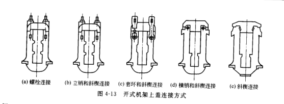 (4)横销和斜楔连接 这种连接方式是将机架上盖的下部插在立柱上端的凹槽内,并用穿透的横向圆销连接,再用斜楔楔紧,此种连接结构简单、 连接牢固、连接件变形小、 刚性较好、换辊方便,但由于楔紧力和轧制冲击力的影响,横销易发生变形,影响拆卸和换辊。